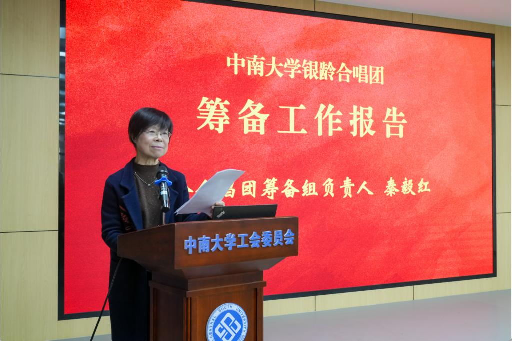 仪式伊始,全体参会人员肃立齐唱国歌,雄壮激昂的旋律奏响活动序幕,也凝聚起在场每一位中南人的家国情怀与集体荣誉感。随后,合唱团筹备组负责人秦毅红作筹备工作报告,详细梳理合唱团从筹备组成立、启动招新,到正式开启排练、踊跃参与各类演出的艰辛历程与丰硕成果。据悉,合唱团历经严格专业的招新面试、资格审查等环节,从180余名报名者中最终吸纳70名离退休教职工团员,至今已累计开展11次日常排练,圆满完成两首作品打磨并成功参与两场演出,为合唱团正式成立筑牢了坚实基础。
