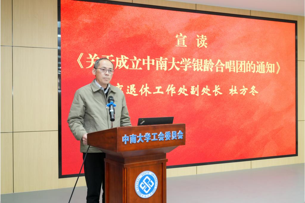 离退休工作处处长向英明对银龄合唱团的成立表示热烈的祝贺,向为合唱团筹备工作默默耕耘的各方人士及踊跃加入的老同志们致以最诚挚的问候与敬意。银龄合唱团的成立,是学校践行积极老龄观、健康老龄化理念的具体行动,是离退休工作处精准服务老同志精神文化需求的重要举措。期望合唱团坚守“快乐合唱、健康同行”的初心使命,打造温暖人心的“银发之家”;深耕艺术实践,锤炼过硬技艺,搭建展现银龄风采的“闪亮舞台”,产生更多更好的招牌曲目;主动担当作为,厚植校园文化底蕴,成为彰显中南魅力的“靓丽名片”。