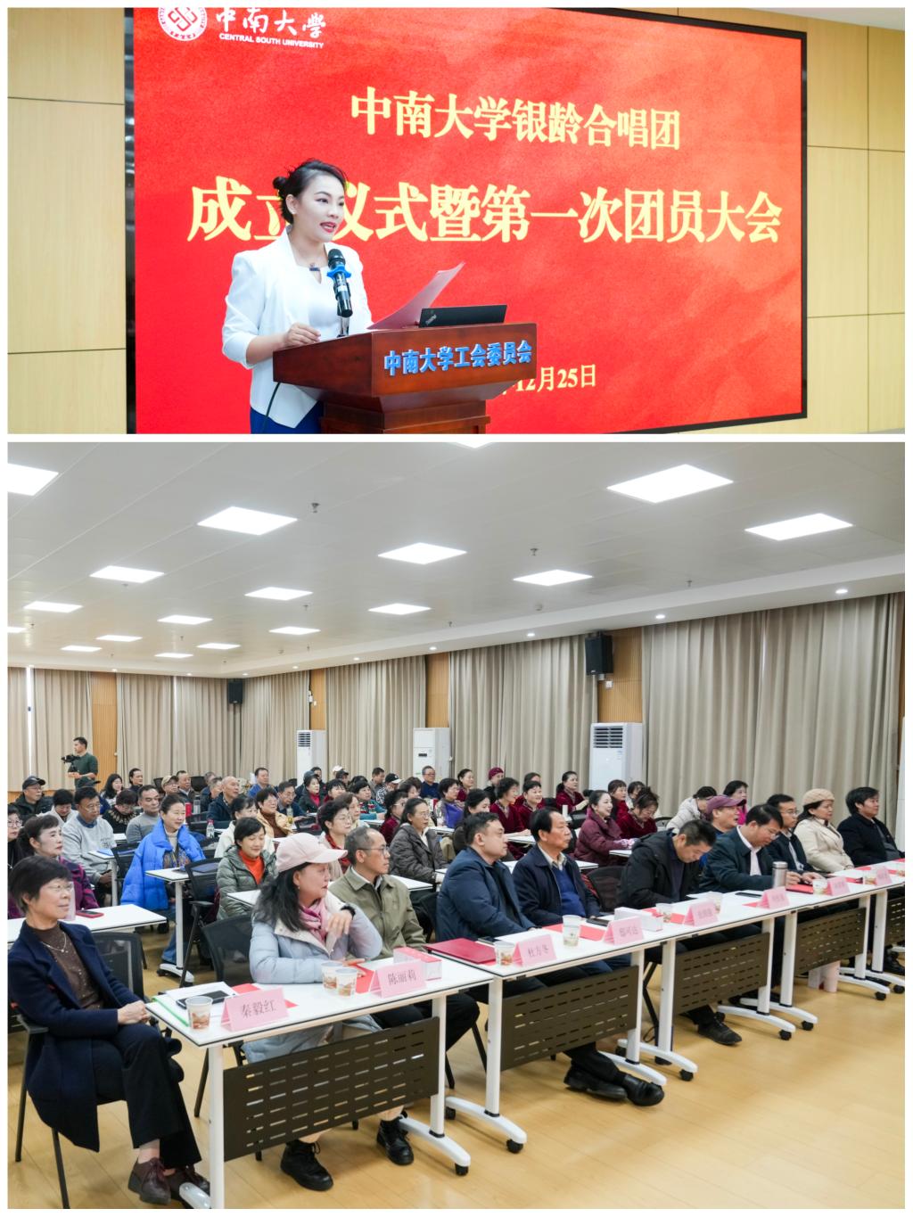 湘江水畔弦歌漾,岳麓山下雅韵长。2025年12月25日上午,中南大学银龄合唱团成立仪式暨第一次团员大会在岳麓山校区校工会四楼多功能厅隆重举行。党委宣传部、校工会、校团委、离退休工作处等相关职能部门负责人,老年大学各分校负责人及银龄合唱团全体团员欢聚一堂,共同见证这一承载银发梦想、彰显校园温情的重要时刻。仪式由离退休工作处何婷主持。