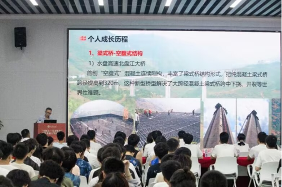 从业十余载,匠心不改,牢记使命,郭吉平一直奋战在施工一线,竭力发挥党员的先锋模范作用,始终保持空杯心态和每天记笔记、一月一小结、一季一汇总、一年一总结的良好习惯。作为行业佼佼者,郭吉平不仅不断完善自身的知识结构,同时也在“传、帮、带”,把“知道”变成“知识”,再把“知识”变成“效益”,引导后来的人沿着这条道路继续披荆斩棘地前进。“民生在勤,勤则不匮”,人世间的一切成就和幸福都源自劳动创造,扎根山区桥隧施工科技创新领域,郭吉平也将继续勇做交通建设排头兵,带领团队攻克重重技术难关,勇攀世界级桥梁工程新高峰。报告会现场氛围热烈,同学们受益匪浅,踊跃提问,郭吉平一一为大家答疑解惑。以榜样力量为标杆,汲取劳动奋进的力量。师生们表示,一定会从郭吉平的劳动精神、工匠精神中汲取精神养分,以实干担当为国家强盛和民族复兴贡献力量,书写新时代劳动者的新荣光!